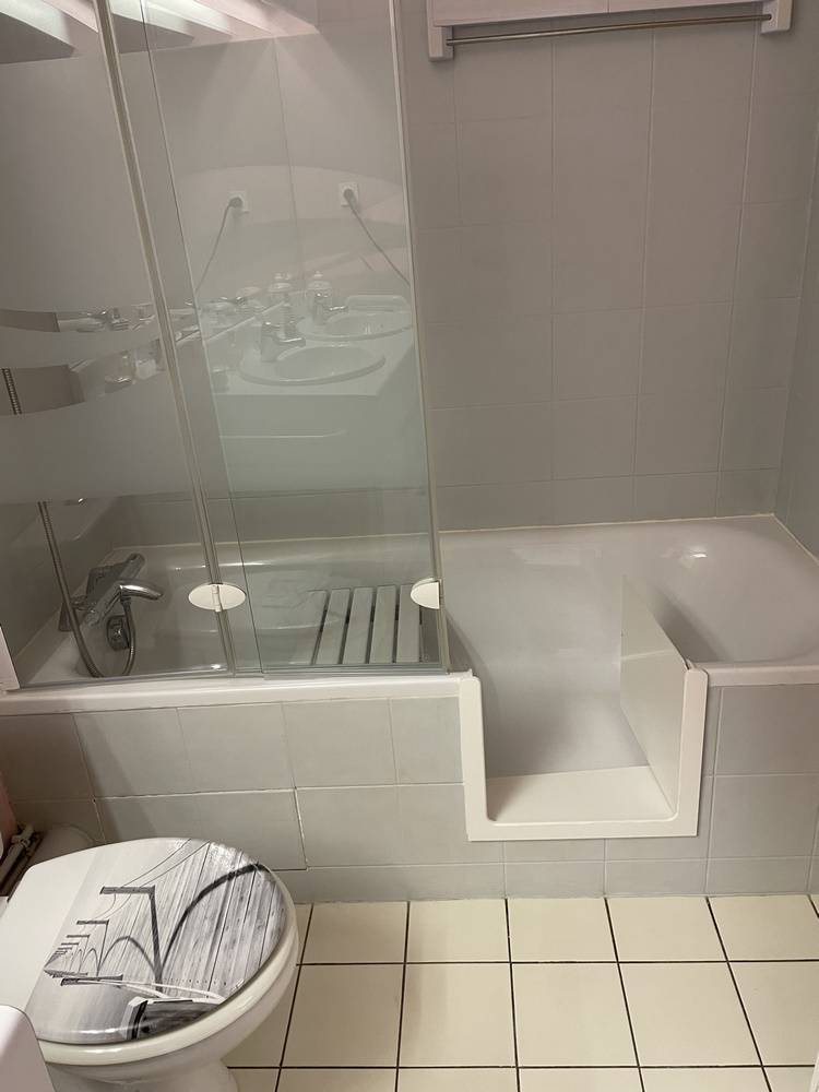 Le siège de bain permet aux clients de faire leur toilette assis. Le pommeau stop douche, lui, permet d'arrêter l'eau sans avoir besoin de manipuler la robinetterie et rend la toilette plus ergonomique.