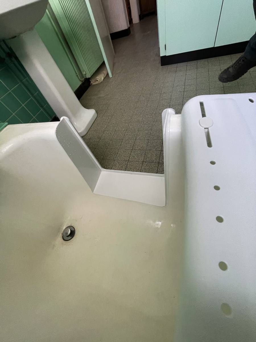 En seulement une journée de travaux, sans démontage de la baignoire, SOBAIN a réalisé cette ouverture dans la baignoire. Grâce à l'intervention de SOBAIN, cette cliente a retrouver de la sécurité et du confort pour sa toilette. De plus, rien n'a été modifié dans la salle de bain. La cliente a conservé tous ses repères et souvenirs dans sa salle de bain.