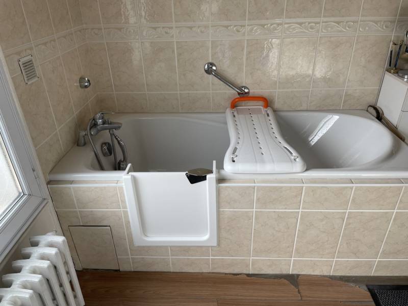 Plutôt que de remplacer la baignoire par une douche, la transformation de la baignoire en baignoire avec porte est une alternative idéale. Cette solution consiste à découper une ouverture dans la baignoire existante et à y installer une porte étanche. Grâce à cette modification, l’accès devient plus bas et plus sécurisé, sans avoir à lever la jambe haut pour enjamber la baignoire. Cela permet de préserver l’autonomie des personnes âgées tout en gardant la possibilité de prendre un bain relaxant.