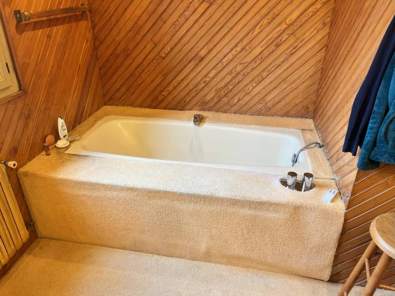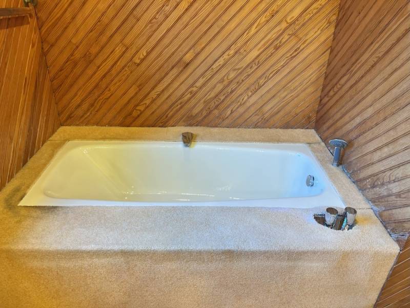 Comme le montre ces photos, il été très complexe de remplacer cette baignoire sans engager de gros travaux : Sol, baignoire encastrée, baignoire en fonte très lourde, ...