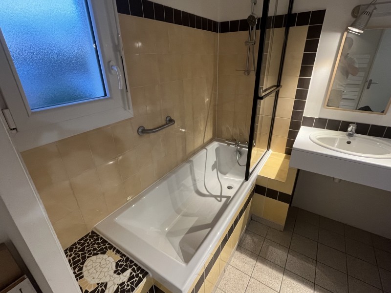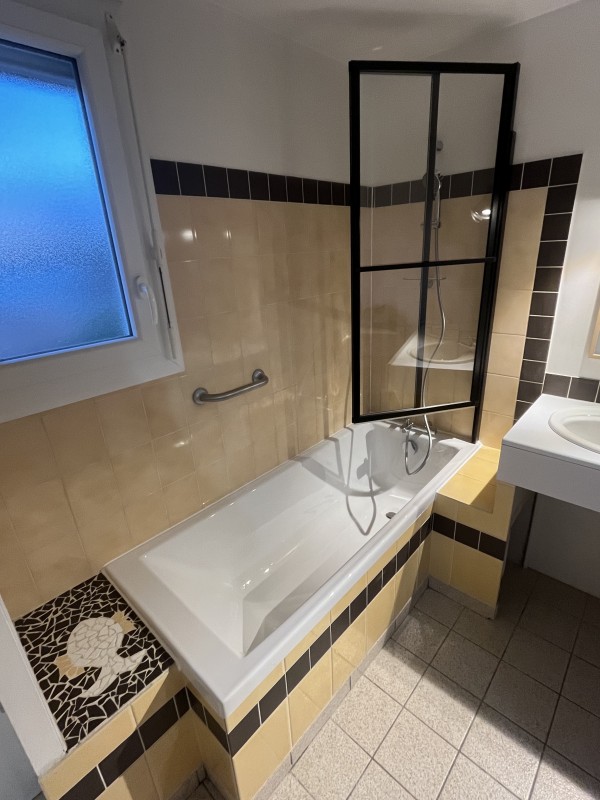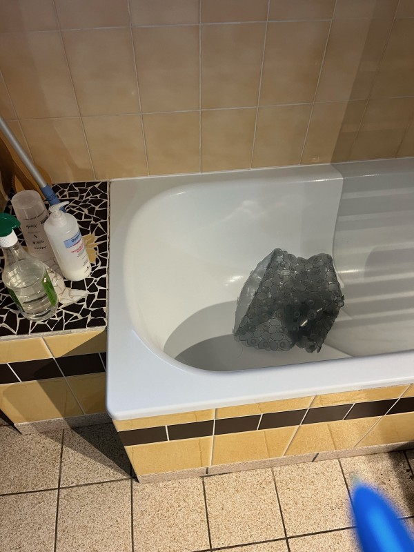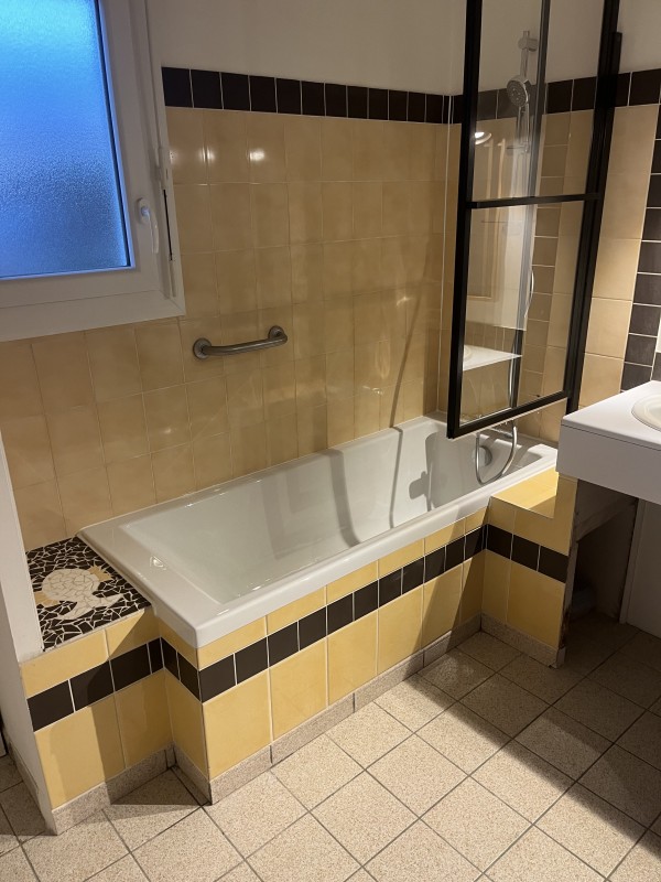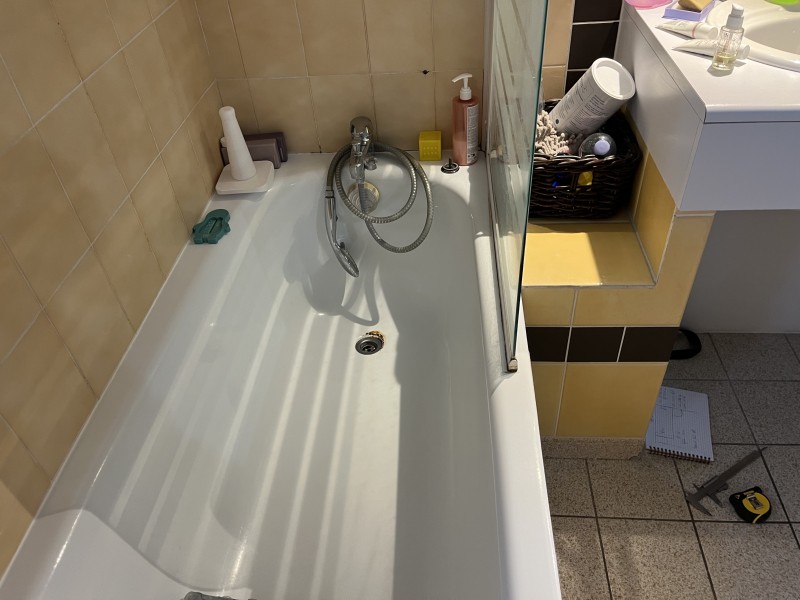 remplacement de leur baignoire. Comme vous pouvez le voir sur les photos, cette baignoire était rouillée, et encastrée dans du carrelage. La salle de bain était dans un bon état. Ces clients ne souhaitez pas se lancer dans de gros travaux de rénovation pour changer le carrelage, refaire une tablette en fond de baignoire, changer le meuble de salle de bain, ...