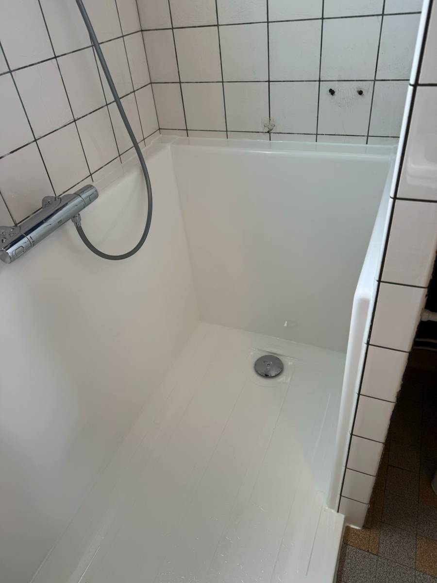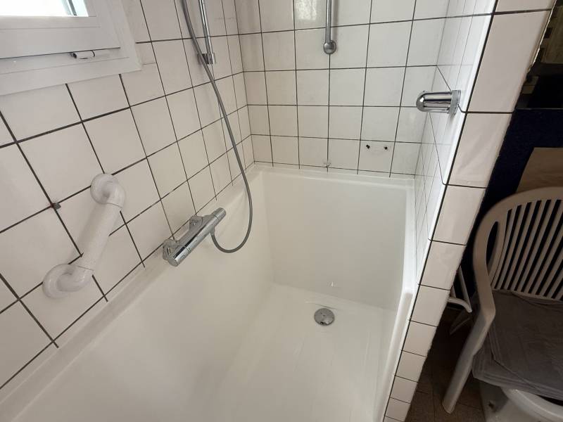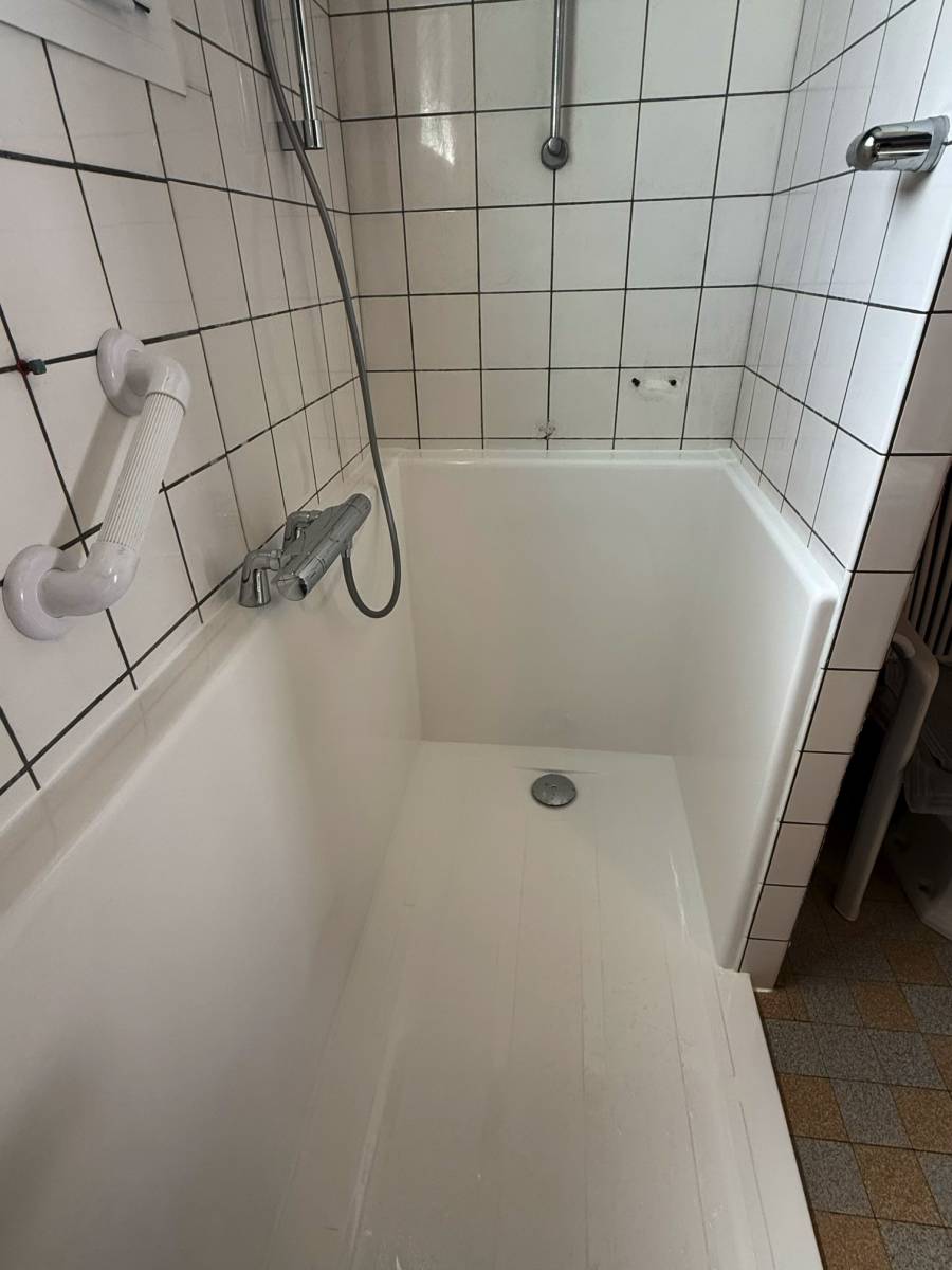 Cette petite marche à l'entrée du bac à douche permet aux usagers de rentrer dans le bac en toute facilité et en toute sécurité.