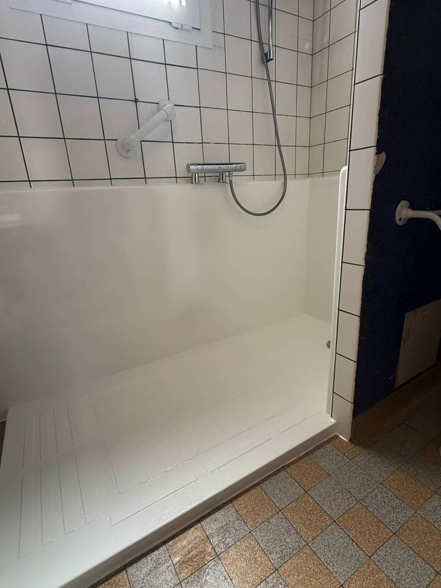 Grâce à l'intervention de SOBAIN, ces clients n'ont plus qu'une petite marche de 3 cm pour rentrer dans leur nouveau bac à douche et accéder à leur toilette.