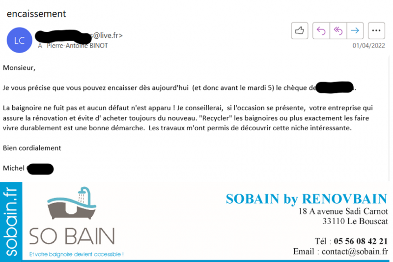 SOBAIN est le numéro 1 de la rénovation de baignoire en Aquitaine. Vous trouverez dans cet article quelques photos de nos réalisations et l'avis d'un de nos clients pour qui nous avons rénové sa baignoire et mis en place un portillon anti éclaboussure afin de lui facilité l'accès à sa baignoire. La satisfaction de nos clients ainsi que le travail de qualité est notre priorité.